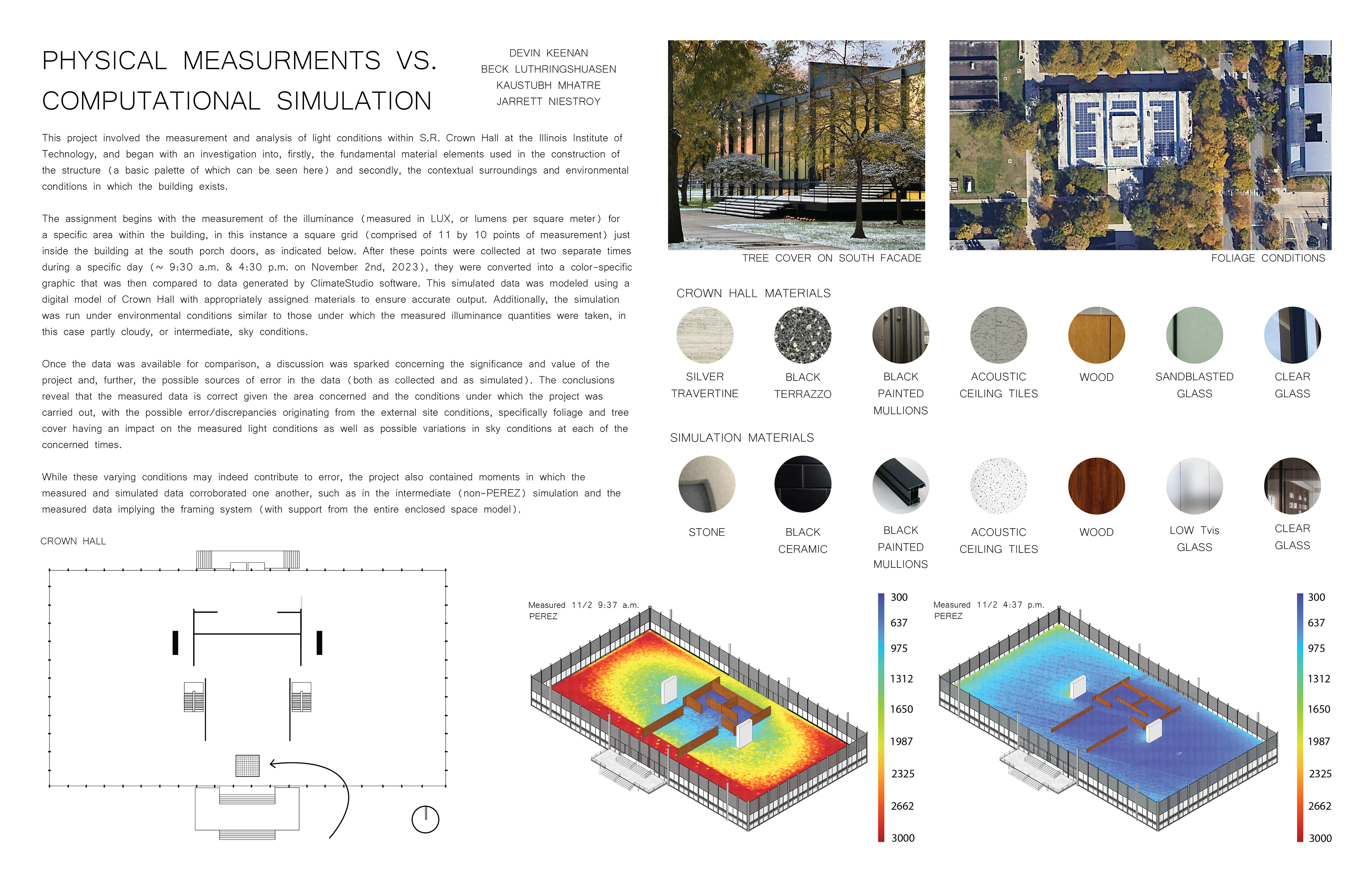 This project involved the measurement and analysis of light conditions within S.R. Crown Hall at the Illinois Institute of Technology, collecting data manually and by climate studio to understand the difference.